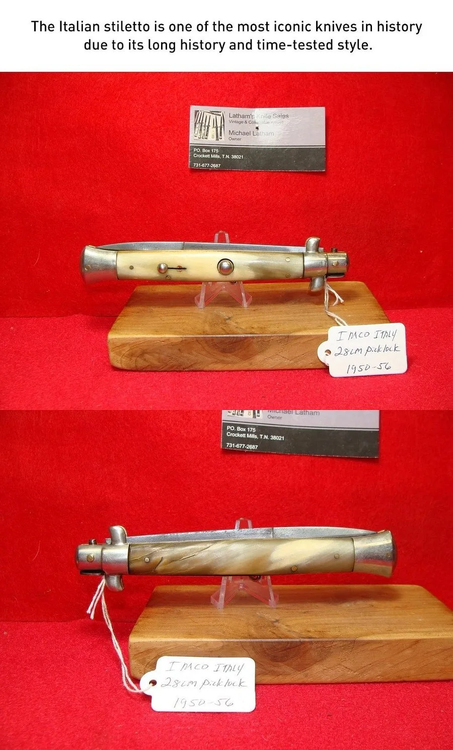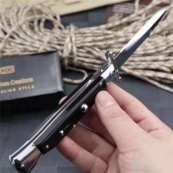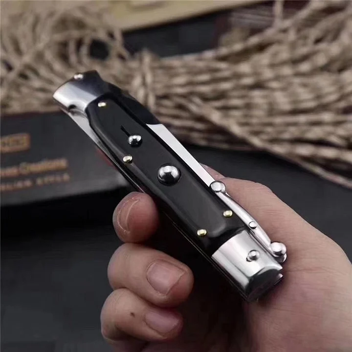Krásný, ručně vyrobený, staromódní italský kapesní nůž se stilettem, rukojeťmi z nerezové oceli a jednobřitou čepelí ve stylu bajonetu.
